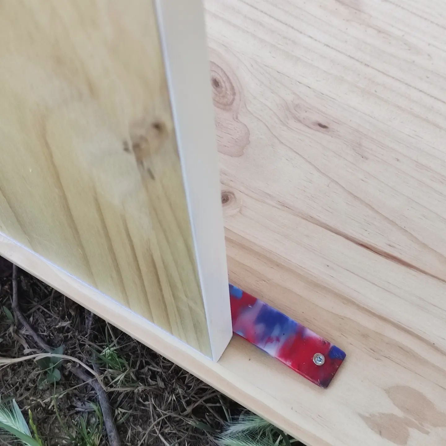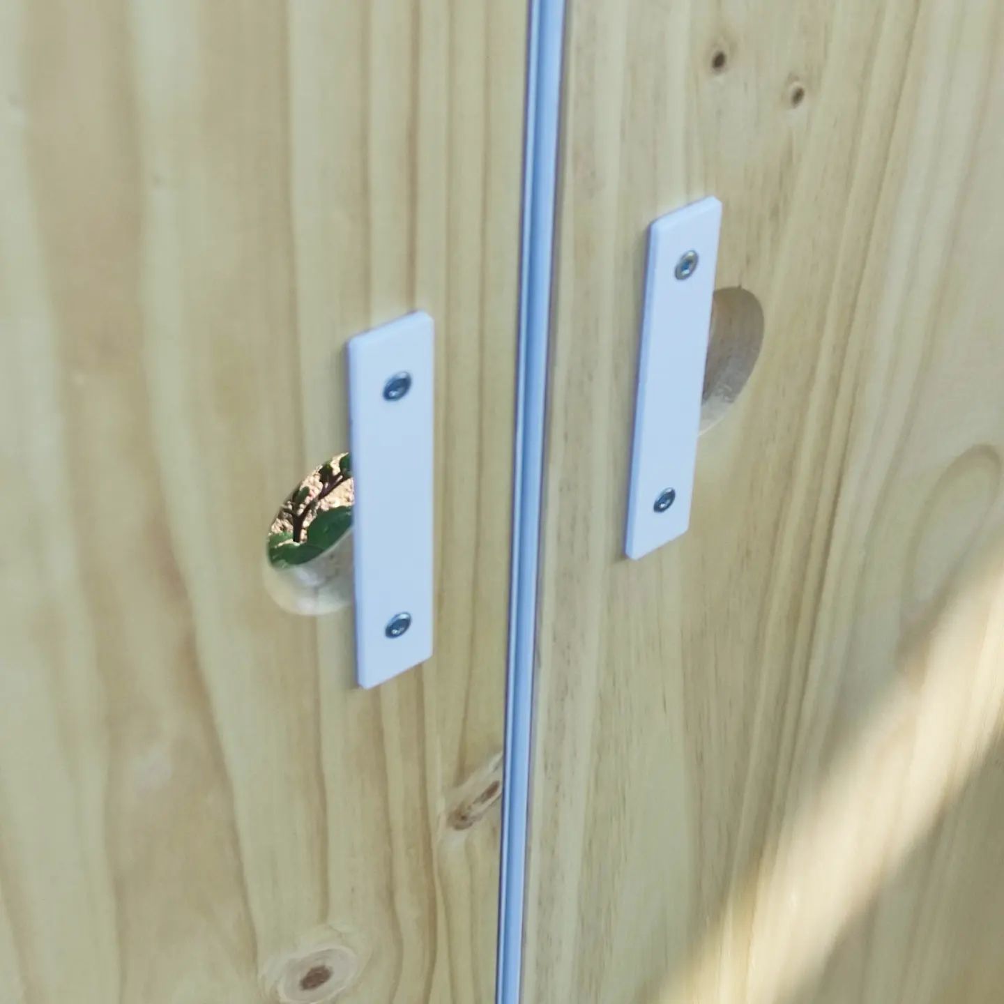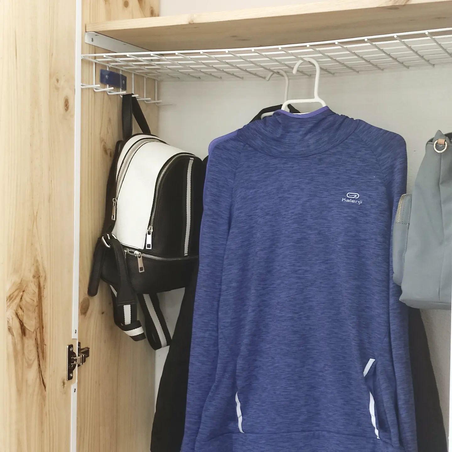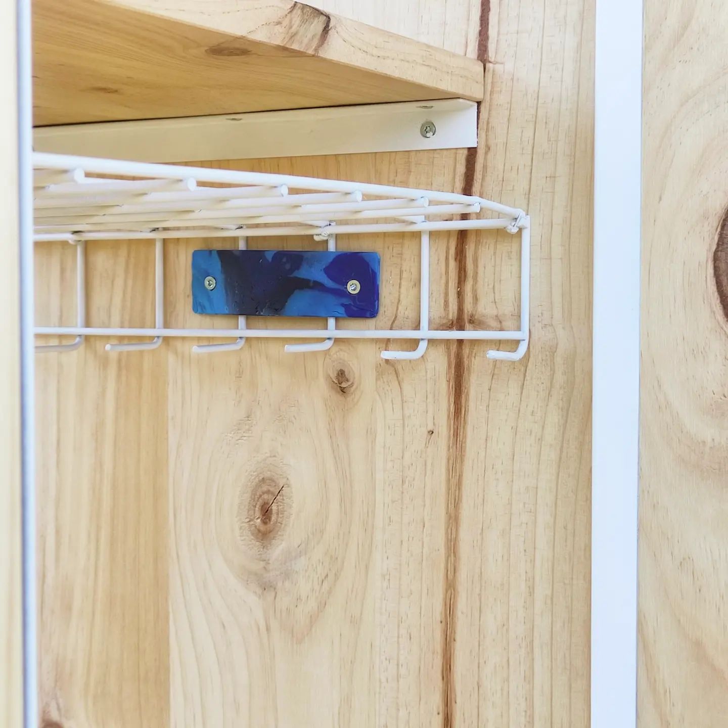 Armario en madera natural con estructura en metal que rodea el armario. Con bisagras de autofreno. Accesorios en plástico reciclado de tapones de botellas. Estructura y accesorios lacados en blanco.