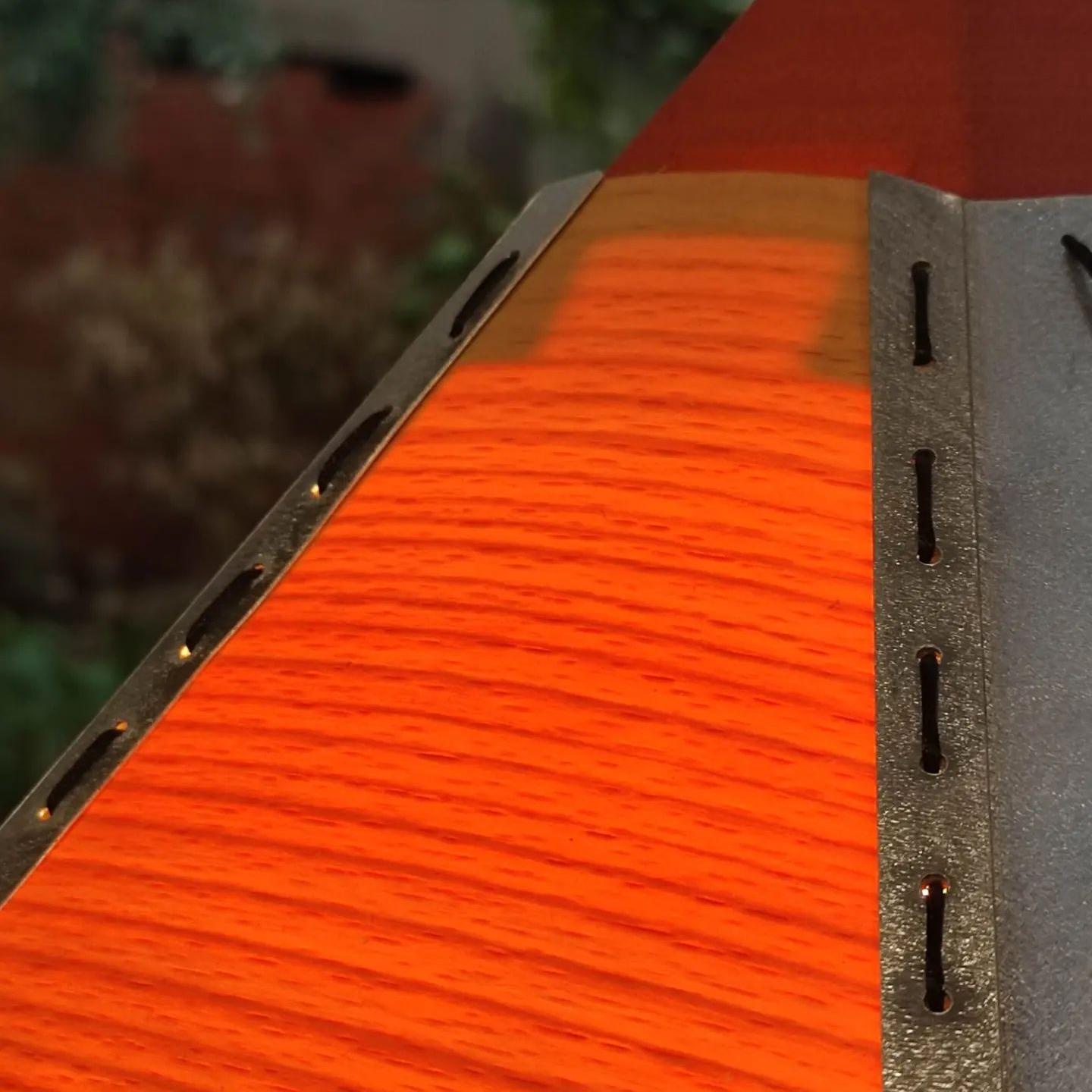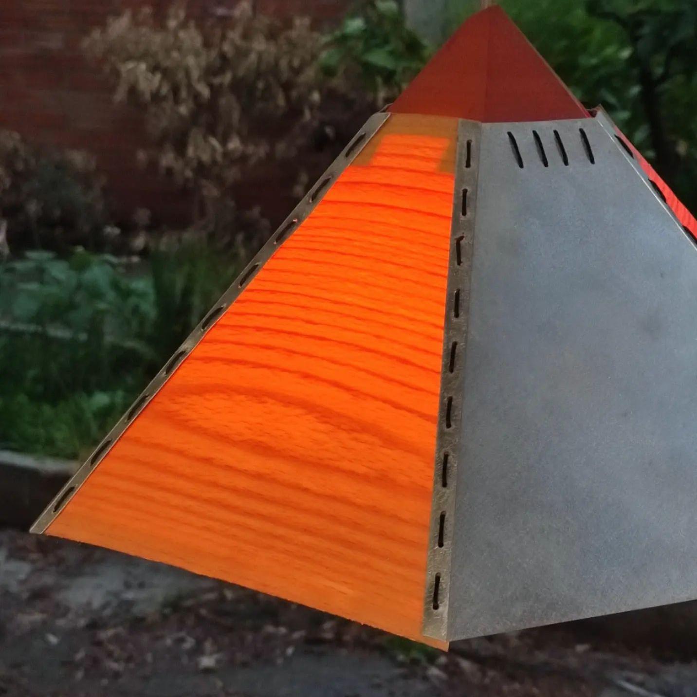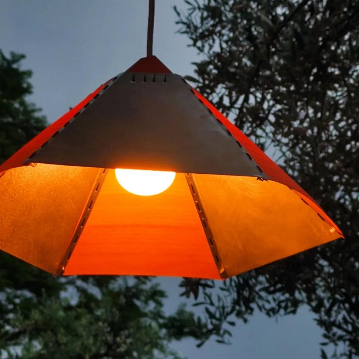 Lámpara con forma hexagonal fabricada en chapa de aluminio, chapa de madera natural e impresión 3D. Unión entre elementos mediante costura.