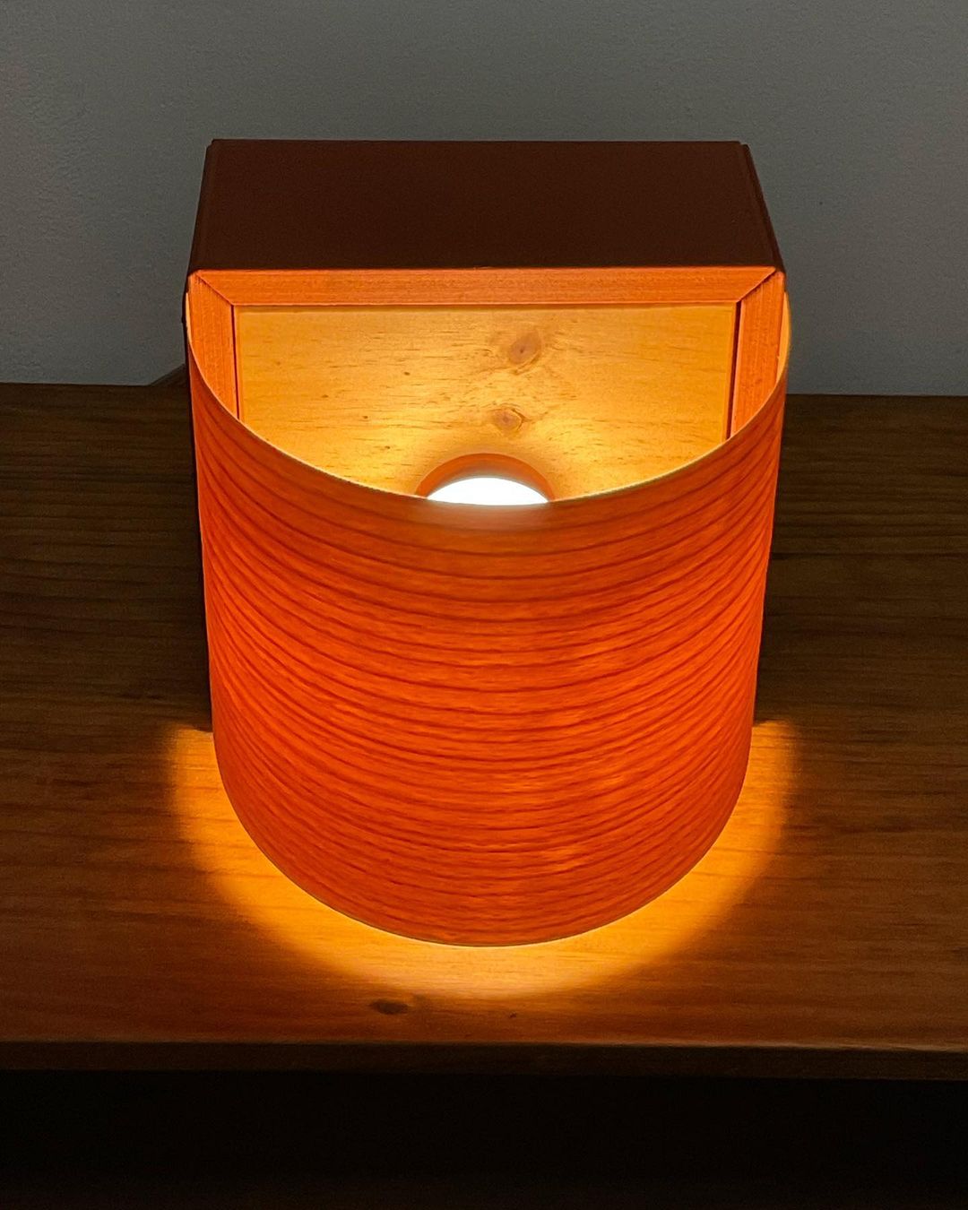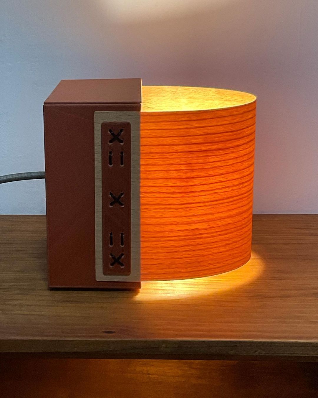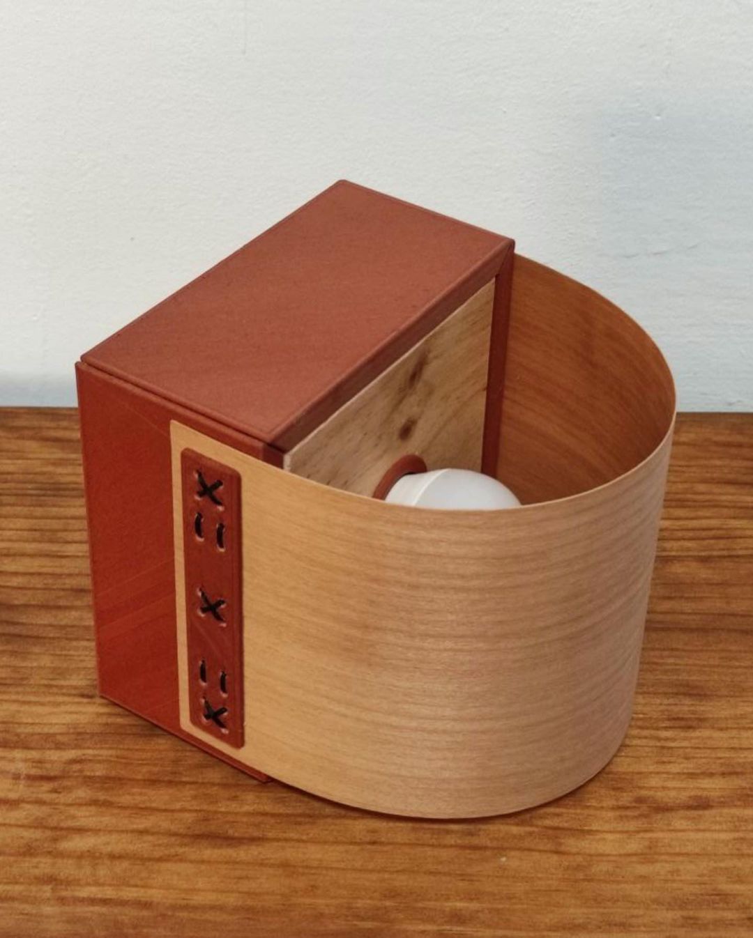 Lámpara fabricada en madera natural, chapa de madera natural e impresión 3D, utilizando como sistema de unión la costura.
