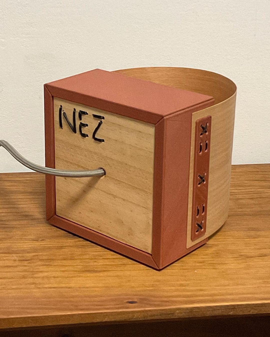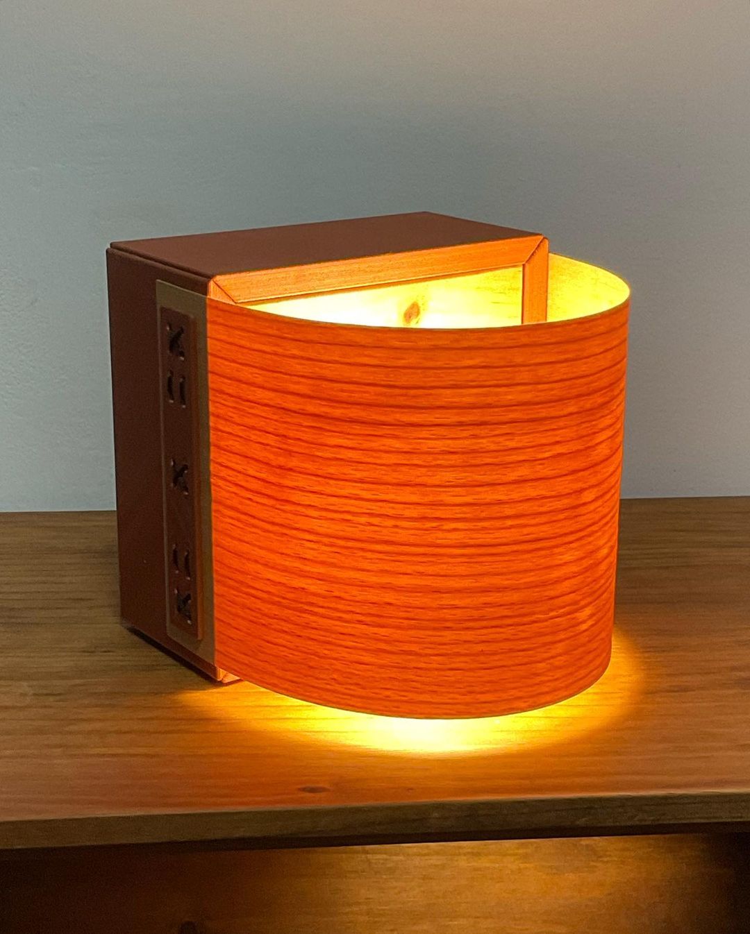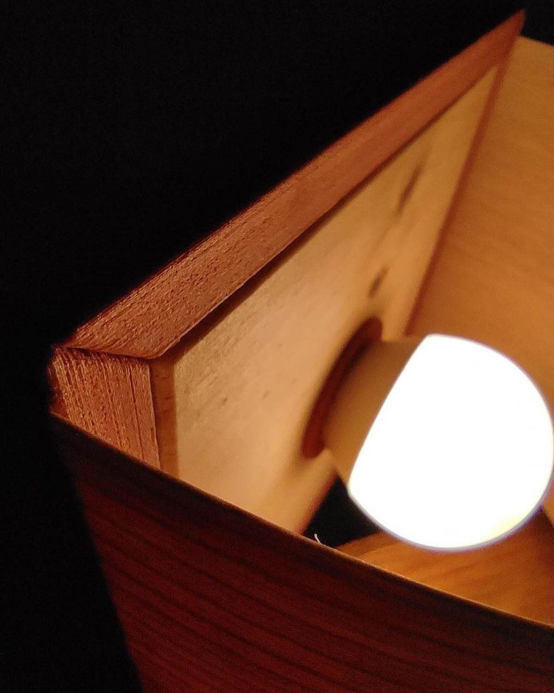 Lámpara fabricada en madera natural, chapa de madera natural e impresión 3D, utilizando como sistema de unión la costura.