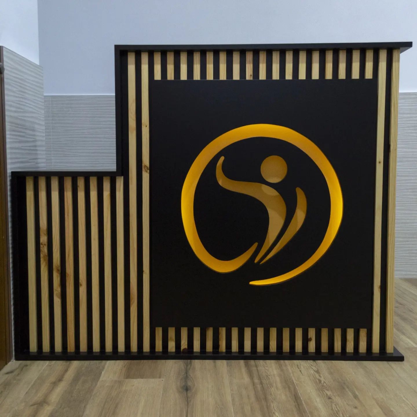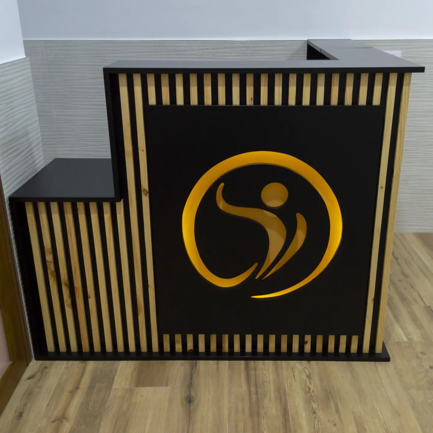Mostrador en mdf lacado con logo frontal retroiluminado LED. Con travesaños verticales en madera natural. Espacio para personas con discapacidad de movilidad.