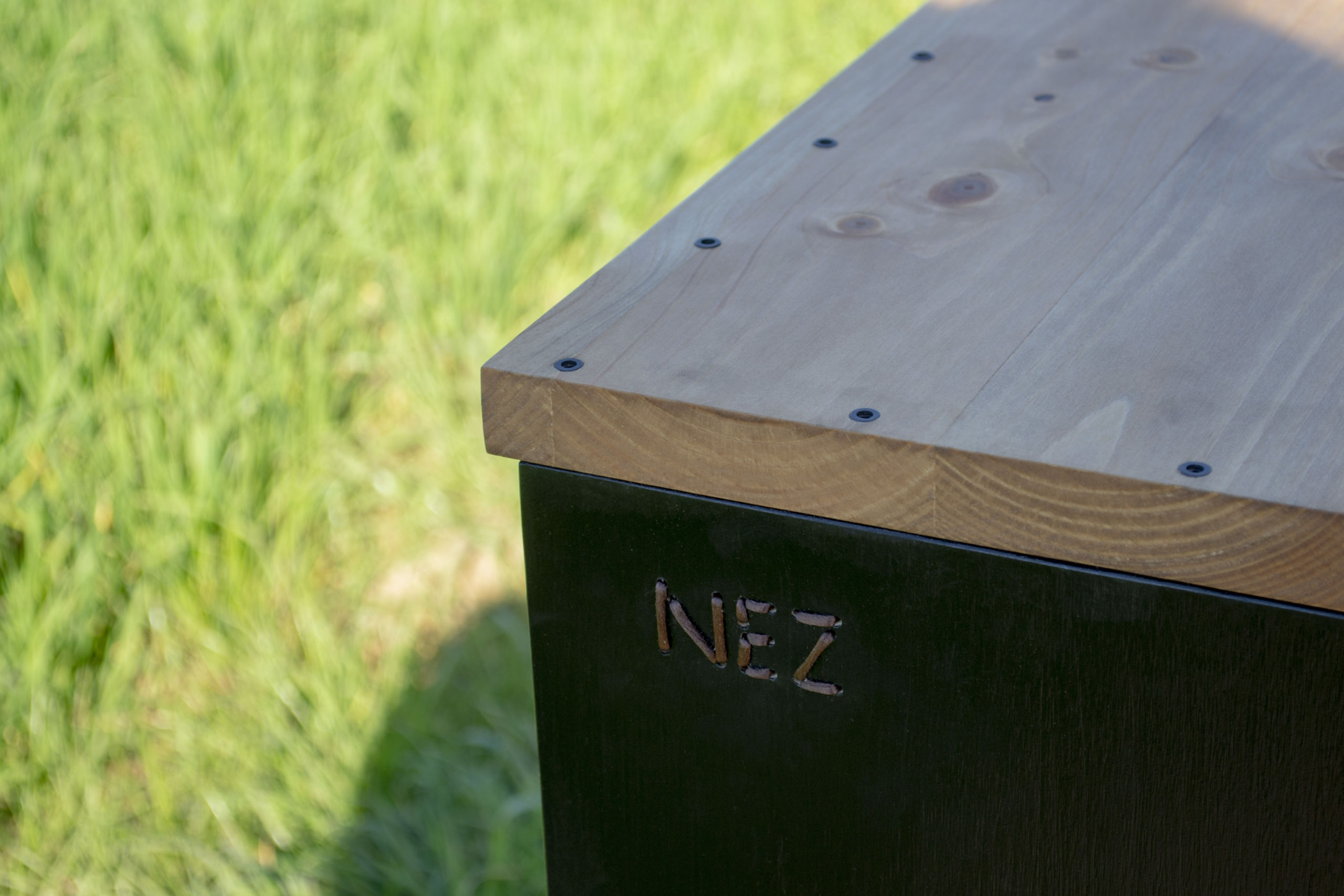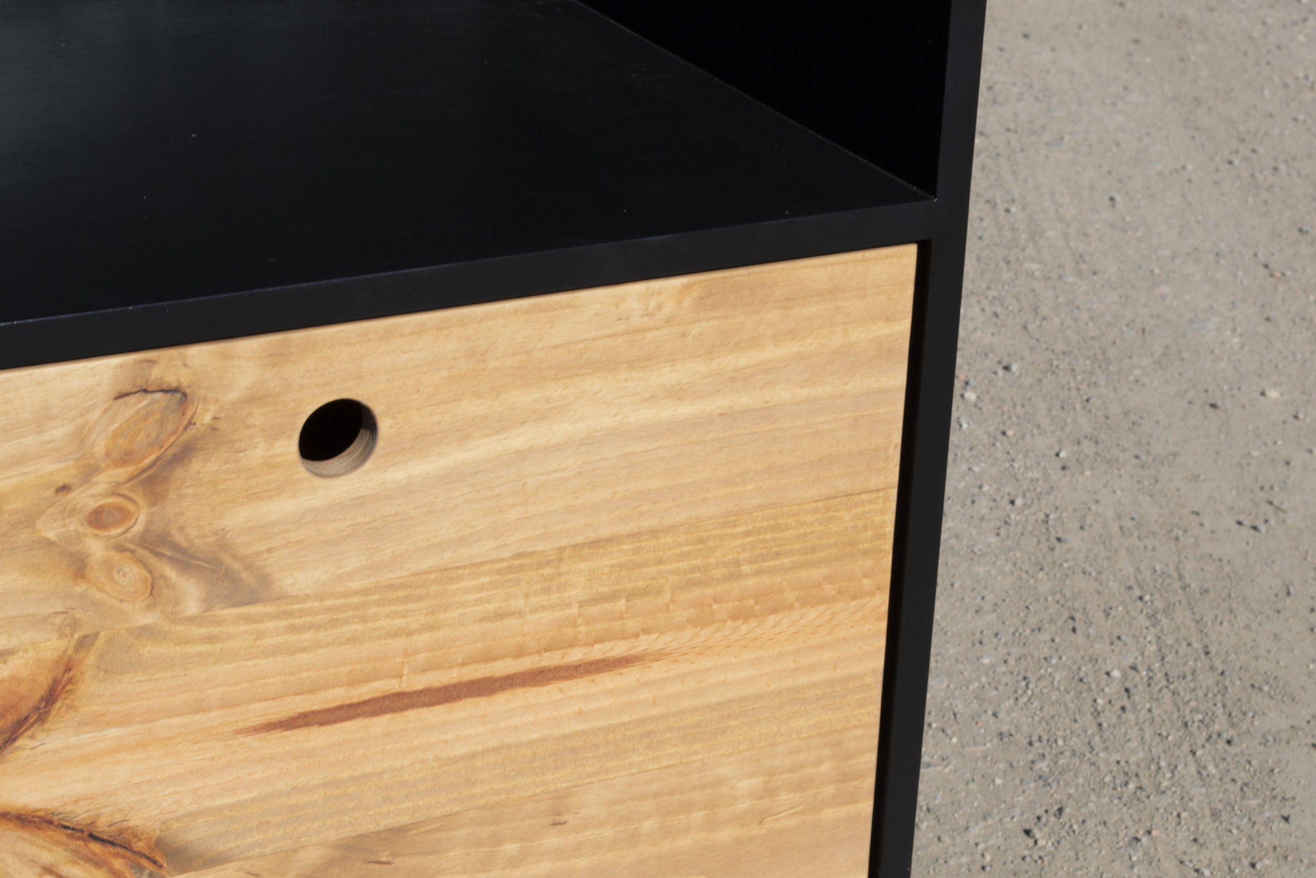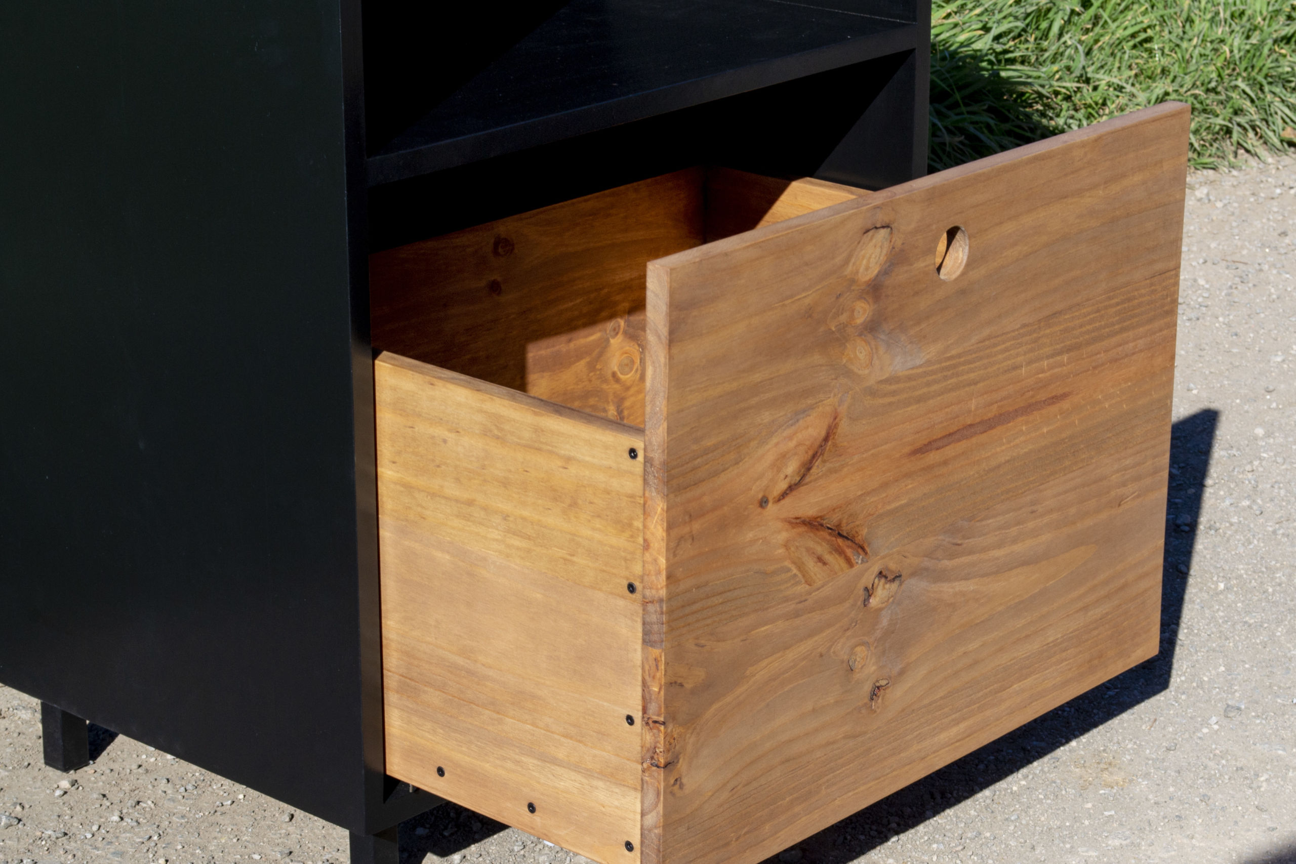 Con cajón en madera y tornillería vista y guías ocultas.